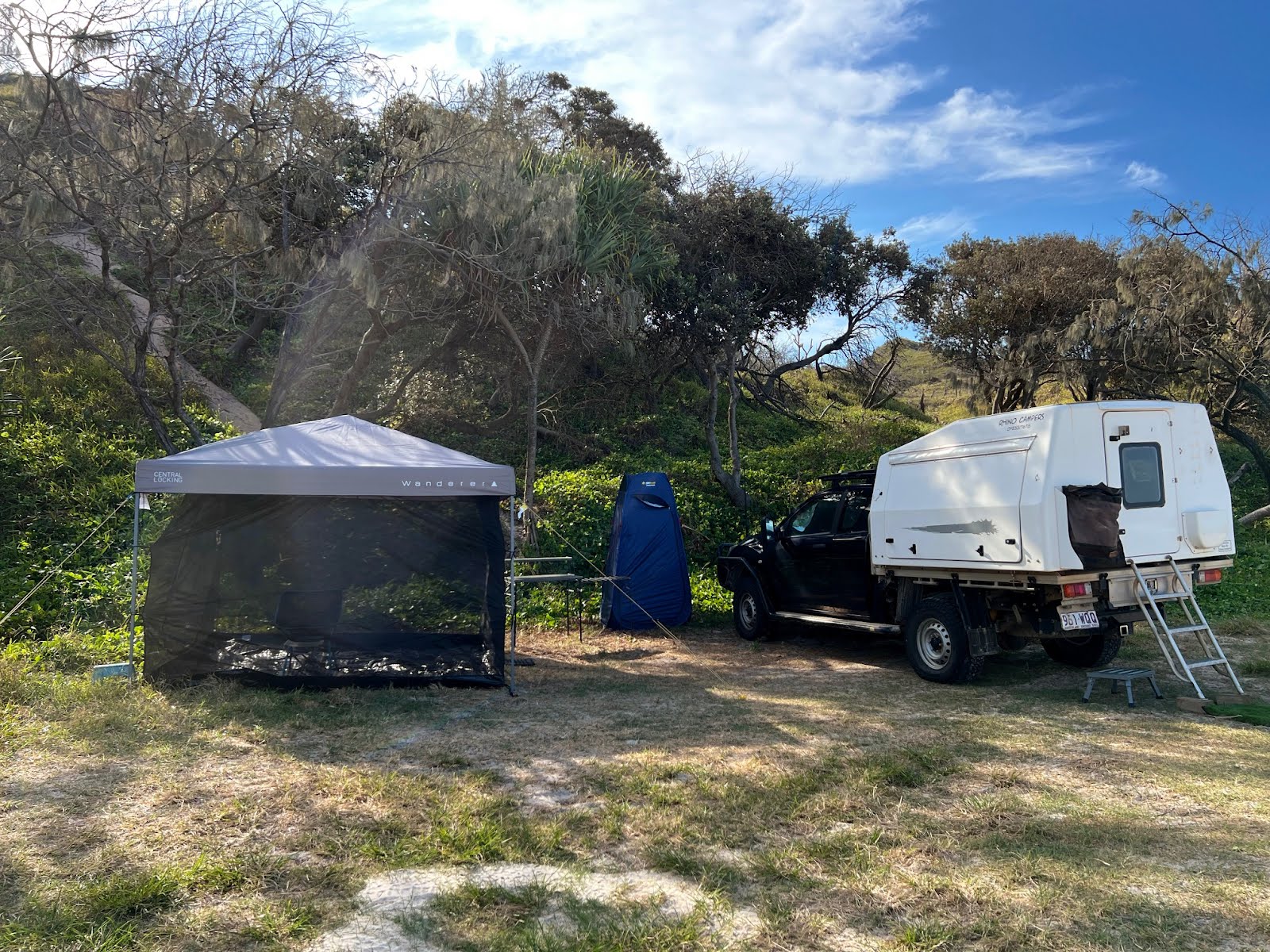 Headed for my dental appointment at Upper Coomera and of course there had been an accident on the M1 which clogged up all the traffic around my area. Had to take the back way by going out through Tallebudgera and then back onto the M1. Made it to the appointment with a couple of min to spare. The local Facebook page said someone had fallen out of their car, seems improbable but who knows. Then a quick clean and check of my teeth and of course some mild nagging about flossing more. That nice clean teeth feeling helped somewhat ease the pain in my wallet, at least for awhile. Then headed north and traffic was flowing nicely only really slowing down at the road works. Had a quick lunch at Hungry Jacks at Wild Horse Mountain and continued north. Turned off at Cooroy and drove down to Tewantin and the car ferry across the Noosa river. Pulled up at the third cutting and let the tyre pressures down to 18 psi and proceeded to drive out onto the beach. Of course I made the rookie mistake of forgetting to engage 4WD but once that was engaged I reversed a few meters and drove out of the soft sand easily. It was about 1:30 pm and high tide was about 3:20 pm but it was a low high tide of only about 1.4 m. It was an easy drive up the beach with not many other cars or people about. Found a nice spot near the north end of Zone 3 that was a little protected from the northerly wind which was basically blowing straight down the beach. Got camp setup with the new gazebo which is the same as the old gazebo but not twisted.